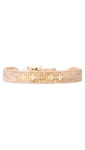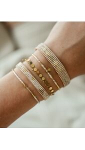 Deze prachtige verstelbare armband is gemaakt van de mooiste witte, beige en gouden kraaltjes. Draag alleen of samen met de andere armbanden uit de collectie voor een te leuke armparty!