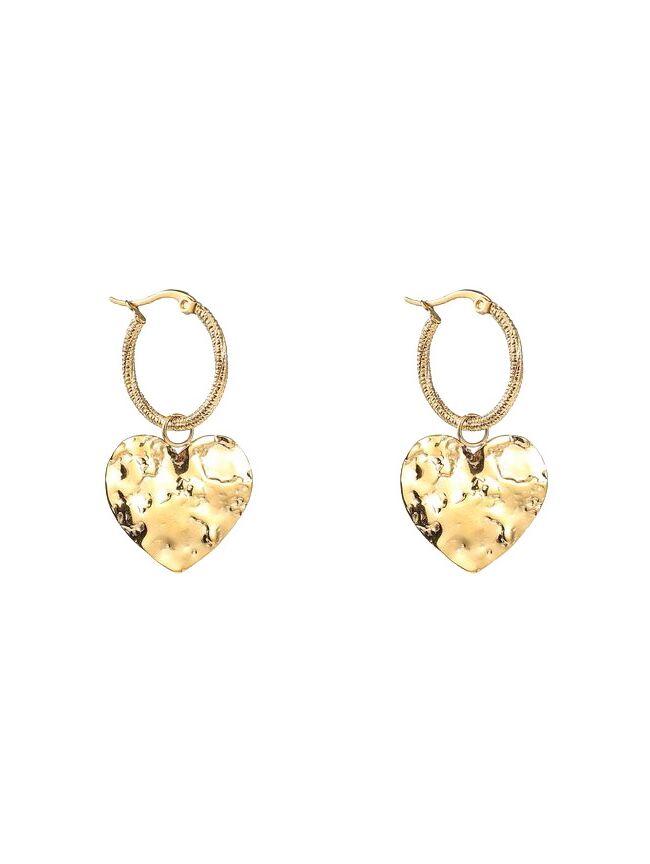 Deze gouden hoops met hammered hartbedel zijn dé perfecte mix van stoer en girly. De subtiele sparkle in de ring en de speelse hartvorm maken elke look meteen een beetje special. Draag ze solo voor een classy touch of combineer met meerdere sieraden voor een trendy earparty look.