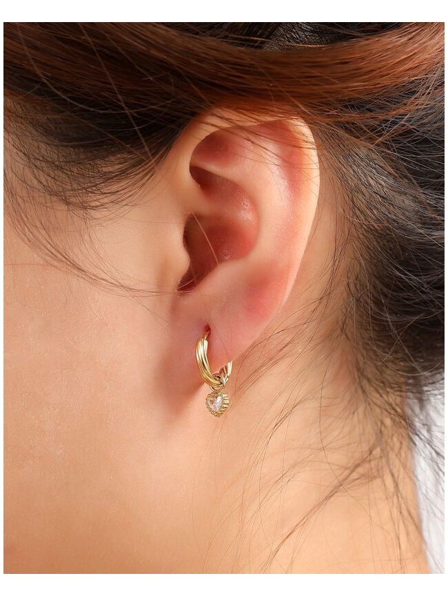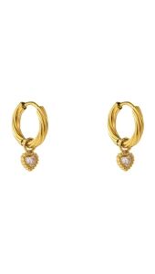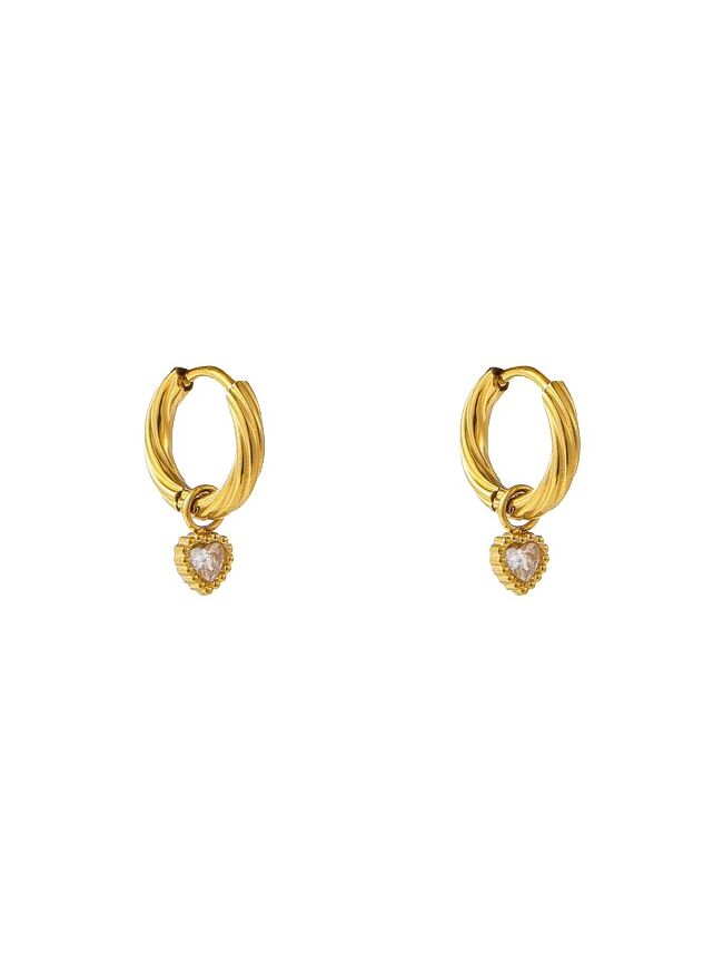 Stijlvolle goudkleurige oorringen met een subtiele geribbelde afwerking en een verfijnde hartvormige hanger met fonkelend steentje. Een romantische en elegante toevoeging aan jouw sieradencollectie.