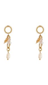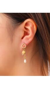 Deze gouden oorbellen met speelse bedels en parel geven jouw look een unieke, vrouwelijke touch. De combinatie van de bloem, warme kraaltjes en subtiele parel zorgt voor een trendy maar elegante uitstraling. Perfect om je outfit net dat beetje extra flair en kleur te geven.