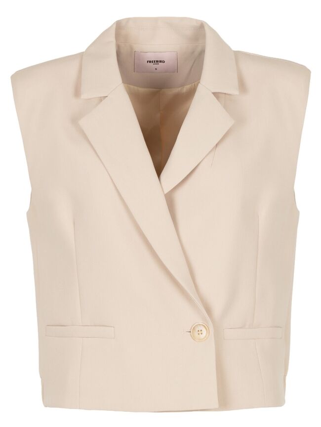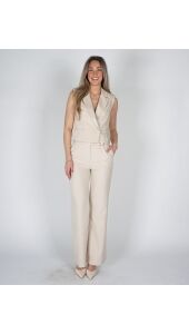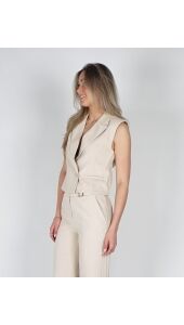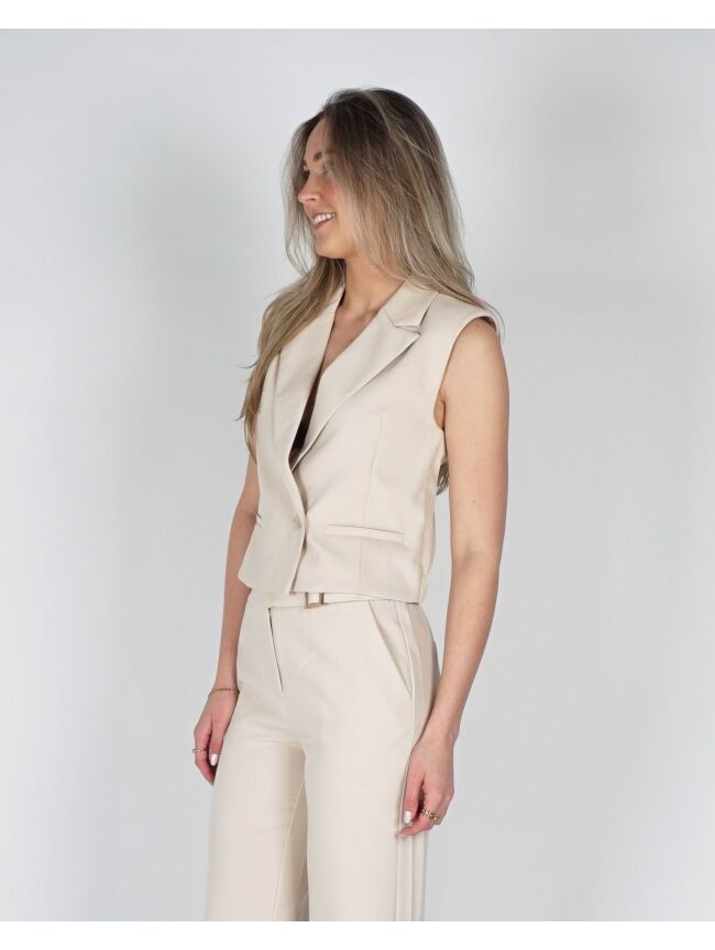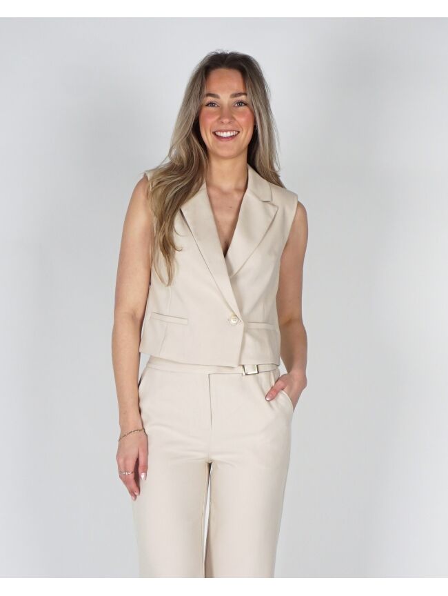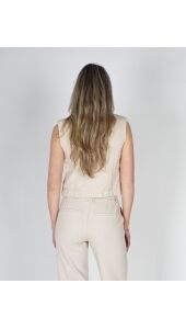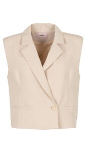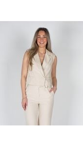 Een verfijnd, getailleerd gilet met een strakke, moderne uitstraling. Gemaakt van een geweven viscosekwaliteit die zorgt voor een gestructureerd maar comfortabel gevoel. De knoopsluiting geeft een klassieke, verzorgde touch, terwijl de elastische achterkant zorgt voor een flatterende pasvorm en extra comfort. Een veelzijdig layering-item dat moeiteloos over blouses en knitwear gedragen kan worden, of op zichzelf voor een eigentijdse, getailleerde look.