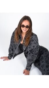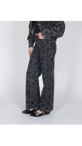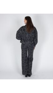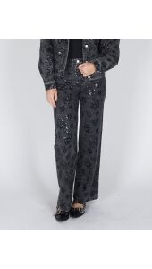 Een trendy denim broek met een stijlvolle, feestelijke touch. De broek is gemaakt van een stevige denim kwaliteit en is versierd met een subtiel paillettenpatroon dat zorgt voor een elegante glans. De wijde pijpen creëren een modern en flatterend silhouet, terwijl het denim materiaal zorgt voor een stoere, comfortabele pasvorm. Perfect te combineren met het bijpassende jasje voor een complete, modieuze look.