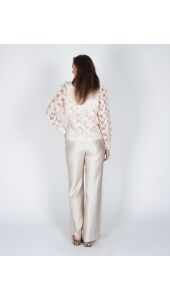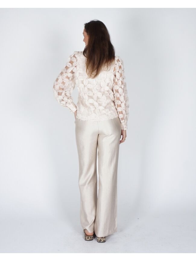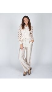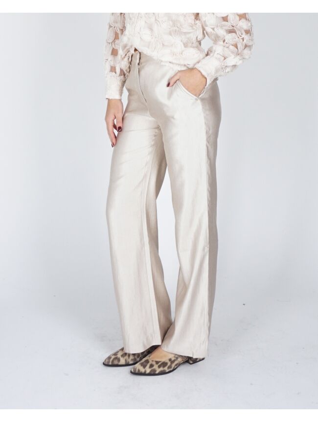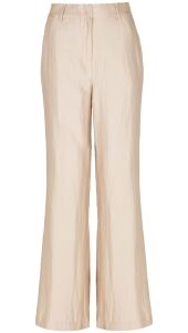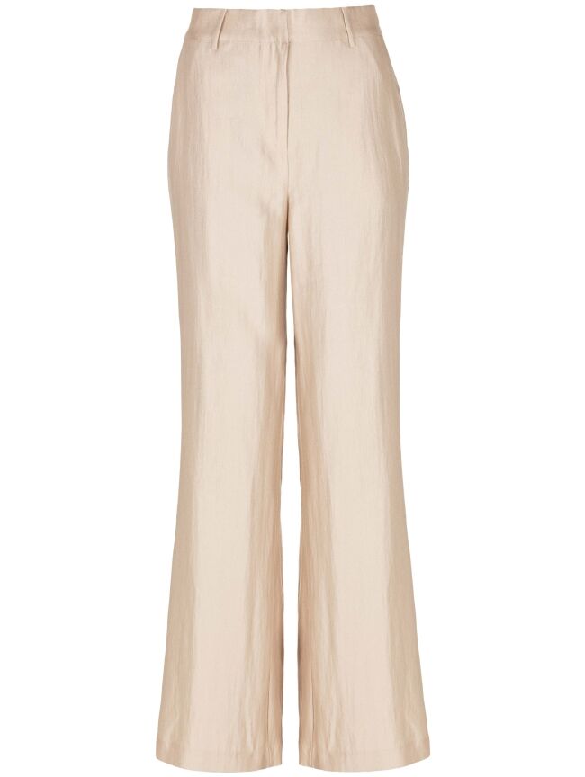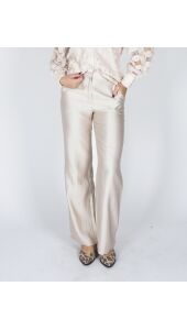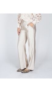 Een elegante pantalon met een luxueuze uitstraling. De broek is gemaakt van een verfijnde woven kwaliteit met een subtiele glans, wat zorgt voor een chique en moderne look. De wijde pijpen creëren een vloeiend silhouet, terwijl de elastische band aan de achterkant extra comfort biedt. Afgewerkt met paspelzakken voor een nette en tijdloze uitstraling. Perfect voor zowel formele als feestelijke gelegenheden