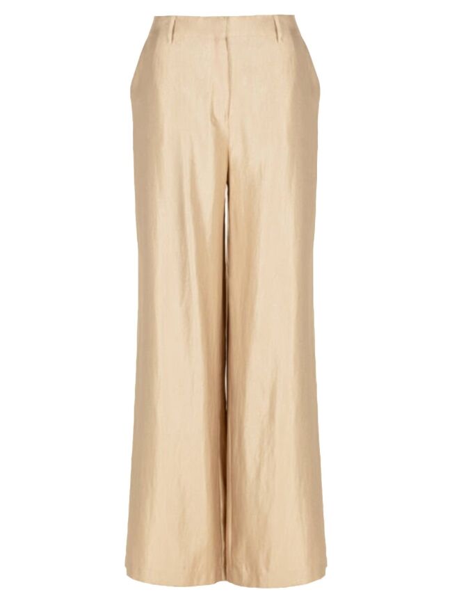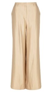 Deze elegante pantalon is uitgevoerd in een geweven kwaliteit met een mooie, subtiele glans die zorgt voor een luxe uitstraling. De wijde pijpen geven het ontwerp een moderne en flatterende fit, terwijl de paspelzakken aan de achterzijde zorgen voor een verfijnde afwerking. Een veelzijdig item dat moeiteloos combineert van chic tot casual.