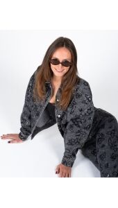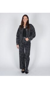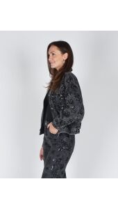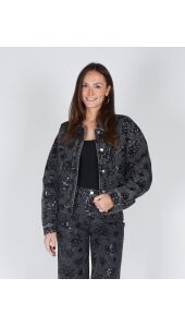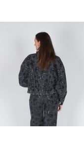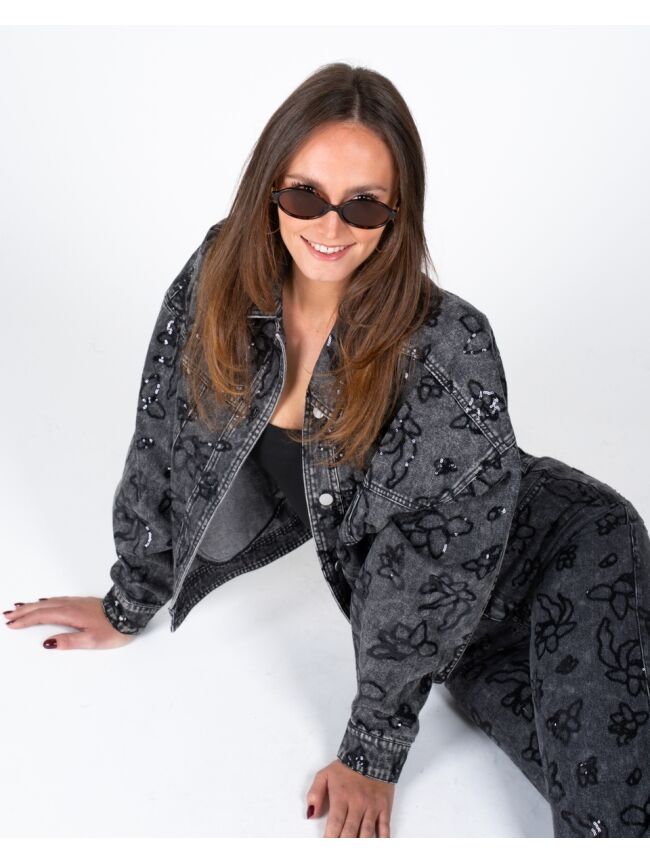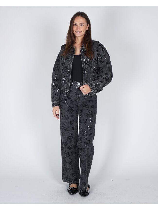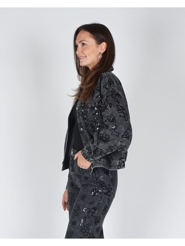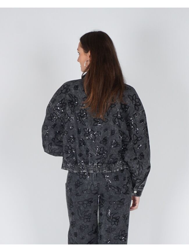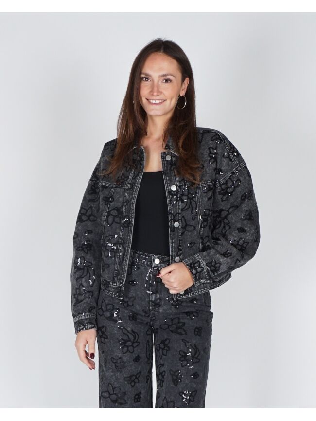 Een opvallend denim jasje met een moderne, glamoureuze twist. Het jasje is gemaakt van een stevige denim kwaliteit en versierd met een subtiel paillettenpatroon dat zorgt voor een stijlvolle glans. De oversized pasvorm geeft het ontwerp een eigentijdse, relaxte look, terwijl de knoopsluiting aan de voorkant zorgt voor een klassieke afwerking. Perfect om een casual outfit een chique en speelse upgrade te geven.