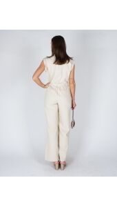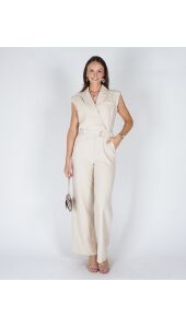 Deze mouwloze jumpsuit is uitgevoerd in een geweven, tailored viscose kwaliteit met een elegante en moderne uitstraling. Het overslagmodel en de bijpassende ceintuur met buckle accentueren de taille en zorgen voor een vrouwelijk silhouet. Een verfijnd item dat moeiteloos comfort en stijl combineert.