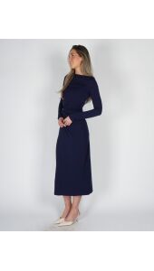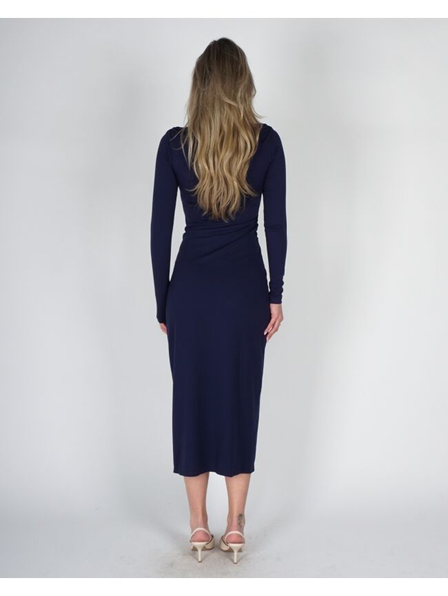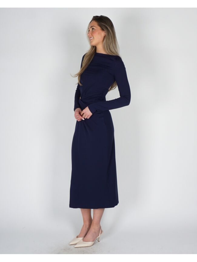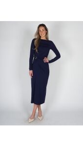 Deze elegante lange jurk is gemaakt van een soepele geweven viscose kwaliteit met stretch, wat zorgt voor een comfortabel en mooi aansluitend silhouet. Het gedrapeerde detail in de taille wordt geaccentueerd door een gouden buckle, wat de jurk een chique en verfijnde uitstraling geeft. Een tijdloos item dat perfect is voor feestelijke en elegante gelegenheden.
