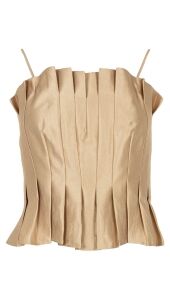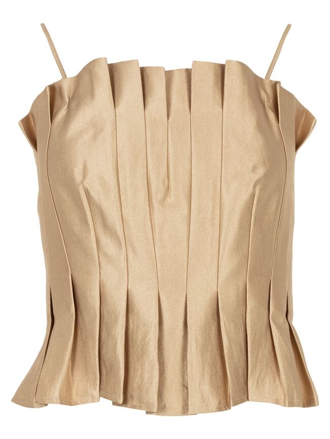 Deze bustier top is gemaakt van een luxe geweven stof met een verfijnde glans. De geplooide voorzijde geeft een elegant silhouet, terwijl de gesmokte achterkant zorgt voor een comfortabele pasvorm. De afneembare bandjes maken het mogelijk om de top op verschillende manieren te dragen.