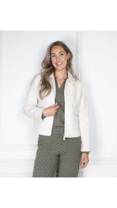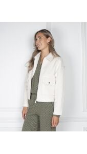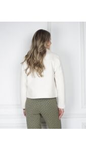 Verfijnd dames jack met een korte, gestructureerde pasvorm. Het model is voorzien van een klassieke kraag, ritsluiting en opgestikte klepzakken met knoopdetail. Gemaakt van een stevige, zachte stof voor een elegante en moderne uitstraling.