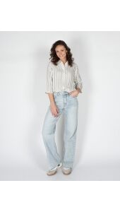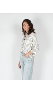 Deze blouse is uitgevoerd in een lichte stof met verfijnde zilveren strepen, wat zorgt voor een subtiele glans. De losse pasvorm en driekwart mouwen geven een ontspannen silhouet, terwijl de klassieke kraag het geheel een verzorgde uitstraling geeft. Ideaal te combineren met een pantalon of denim voor een stijlvolle, moderne look.