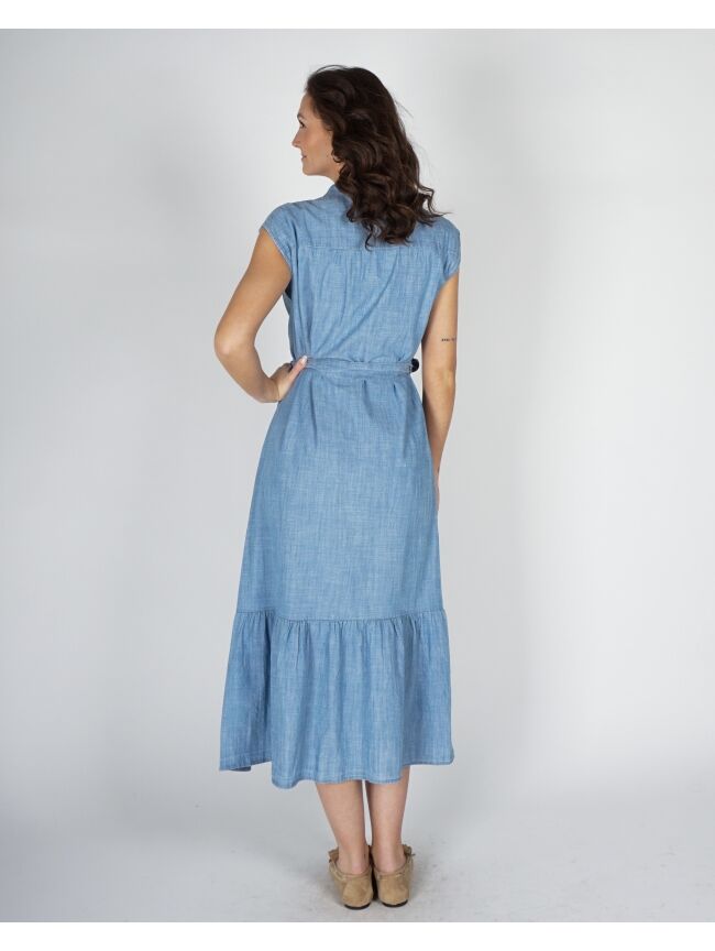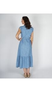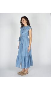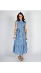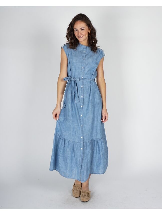 Deze jurk is een luchtige denim maxi-jurk met vrouwelijke flair. Het mouwloze design en de ronde hals geven een zomerse uitstraling. De strikceintuur accentueert de taille, terwijl de volledige doorknoop met subtiele split en stroken zorgt voor speelsheid. Tape op de schouders voegt een sierlijk detail toe.