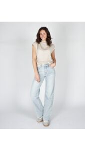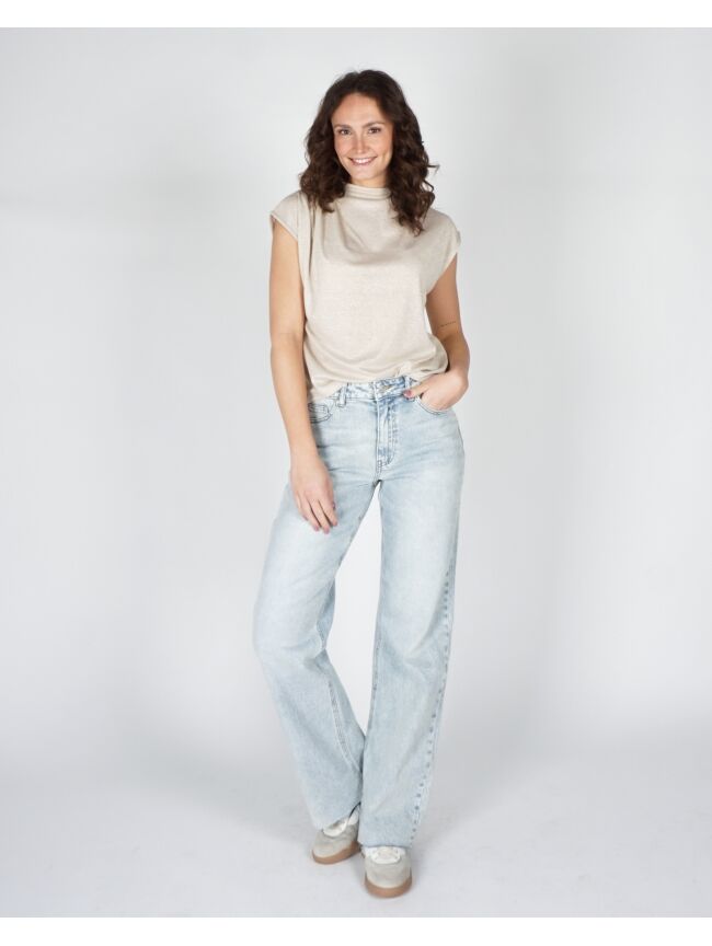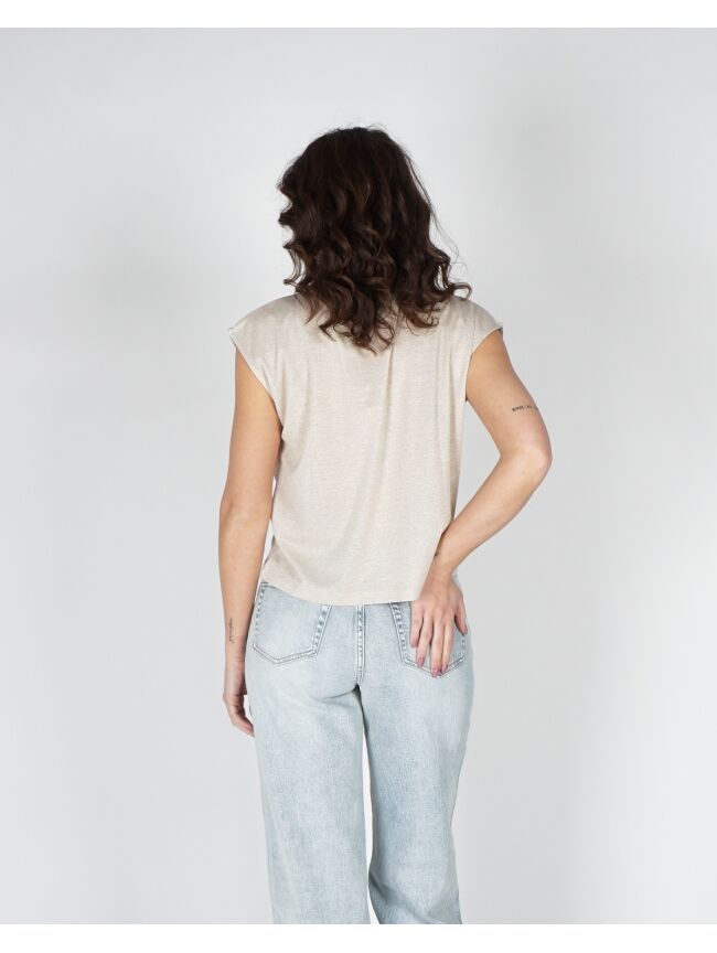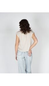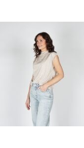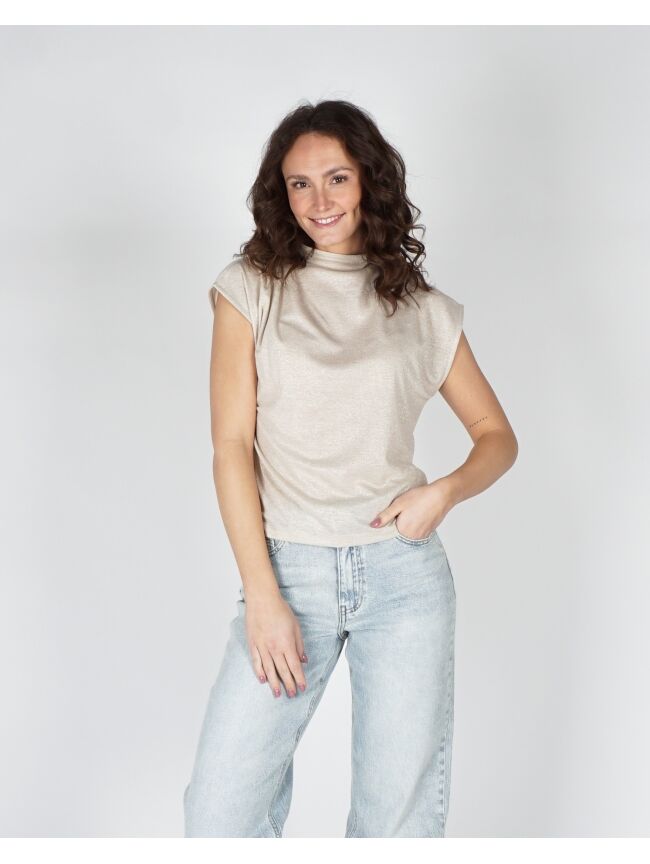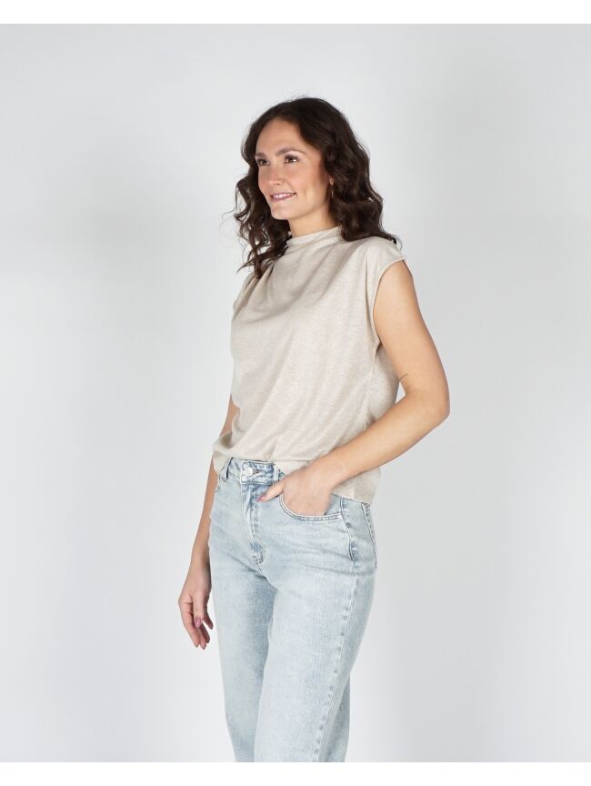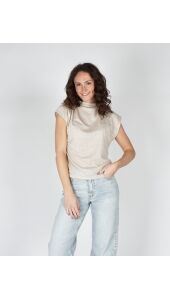 Deze top is uitgevoerd in een zachte beige/ goud tint met een verfijnde, lichte glans ofwel lurex. Het mouwloze ontwerp met kapmouw en opstaande hals zorgt voor een elegante uitstraling. De soepelvallende stof en knoopsluiting aan de achterkant maken deze top geschikt voor zowel overdag als een stijlvolle avondlook.