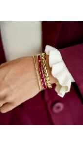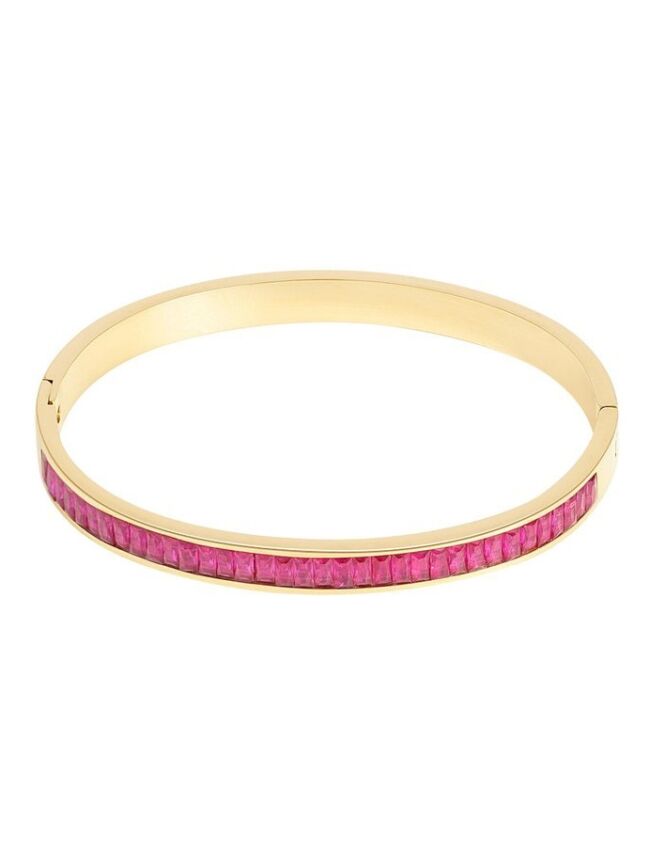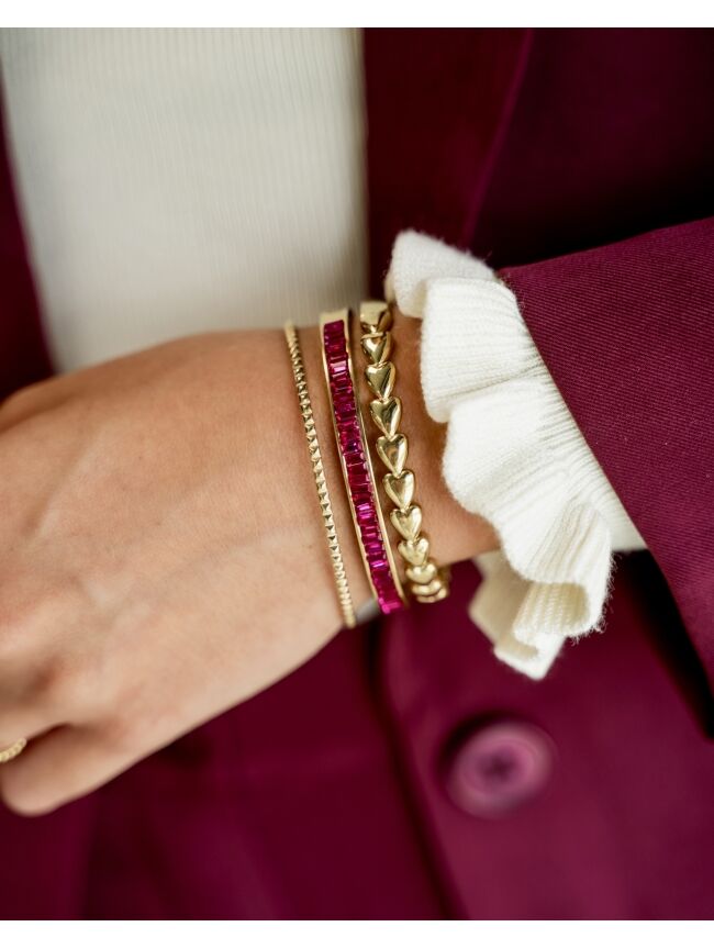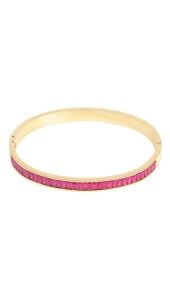 Hoe tof is deze gouden slavenarmband met superleuke fuchsia steentjes van Yehwang! De armband is het perfect te dragen tijdens een chique gelegenheid maar kan ook speels gedragen worden door meerdere armbandjes met elkaar te combineren. De armband is gemaakt van stainless steel met zirkoon en hebben een diameter van 5,8 cm.