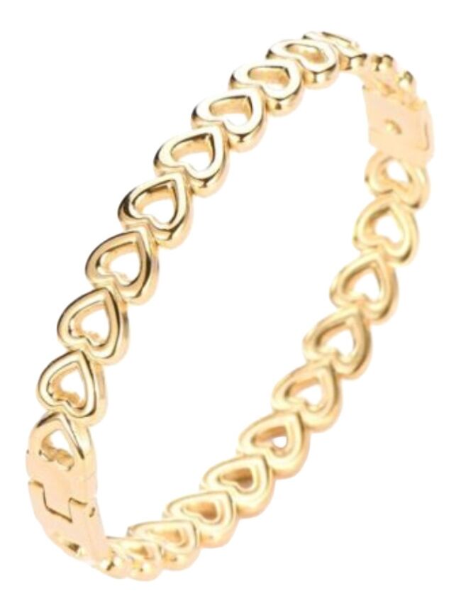 Deze goudkleurige armband met kleine hartjes heeft een speelse en vrouwelijke uitstraling. Het fijne design maakt het een subtiel, maar toch opvallend sieraad. Perfect om elke dag te dragen of te combineren met andere armbanden.