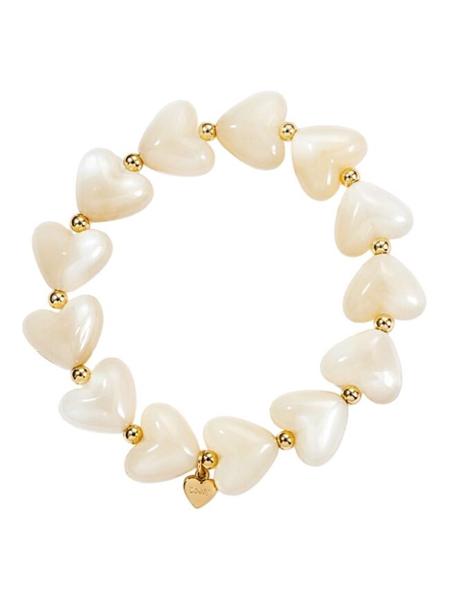 Deze elegante armband met ecru kleurige hartjes straalt rust en verfijning uit. De subtiele glans en gouden accenten maken dit een tijdloos accessoire dat bij elke look past. Ideaal voor zowel dagelijks gebruik als een chique gelegenheid.