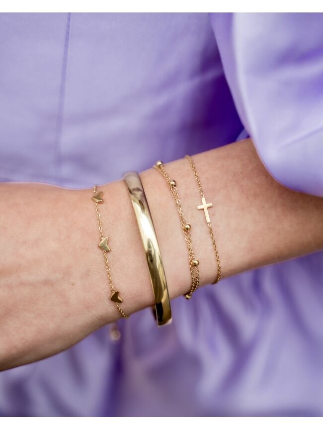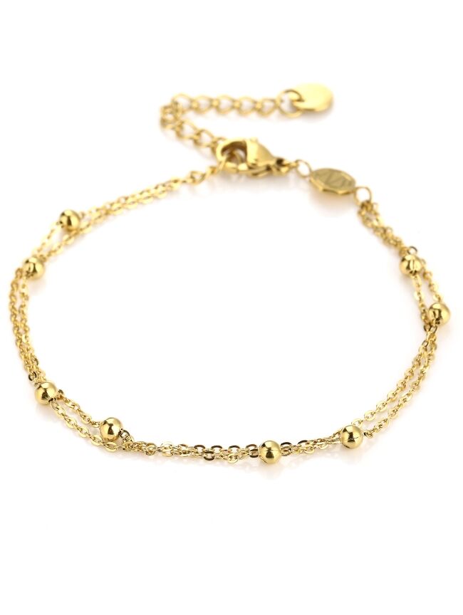 Dubbel zo stijlvol, dubbel zo elegant. Deze verfijnde dubbele armband met minimalistische bolletjes is hét accessoire voor de moderne vrouw die houdt van subtiele luxe. Het dubbele design geeft de armband een gelaagd effect zonder dat je hoeft te stacken, moeiteloos chic met één sieraad.