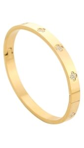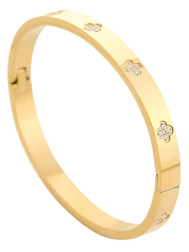 Deze elegante gouden bangle straalt pure klasse uit. De strakke, minimalistische vorm wordt verfijnd door subtiele klaverdetails met fonkelende steentjes. Een perfecte combinatie van tijdloos en chic.
