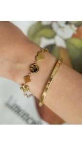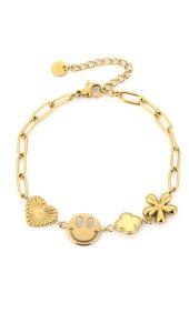 Durf op te vallen met deze statement armband met gouden smiley, hartje, bloemetje en klaver. Hét it-piece voor wie houdt van een edgy twist met een knipoog. De chunky schakelarmband en de charms maken van dit sieraad een echte fashion statement. Speels, gedurfd en helemaal on-trend.
