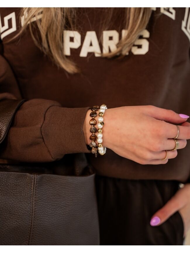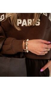 Deze armband combineert glanzende witte parels met goudkleurige kralen voor een tijdloze en chique uitstraling. De klassieke kleuren maken dit sieraad veelzijdig en perfect voor zowel dagelijkse outfits als speciale gelegenheden. Het subtiele bedeltje geeft de armband een verfijnde finishing touch. Dankzij het elastische ontwerp is de armband comfortabel om te dragen en eenvoudig om en af te doen. Prachtig om solo te dragen of te combineren met andere armbanden voor een stijlvolle arm party.