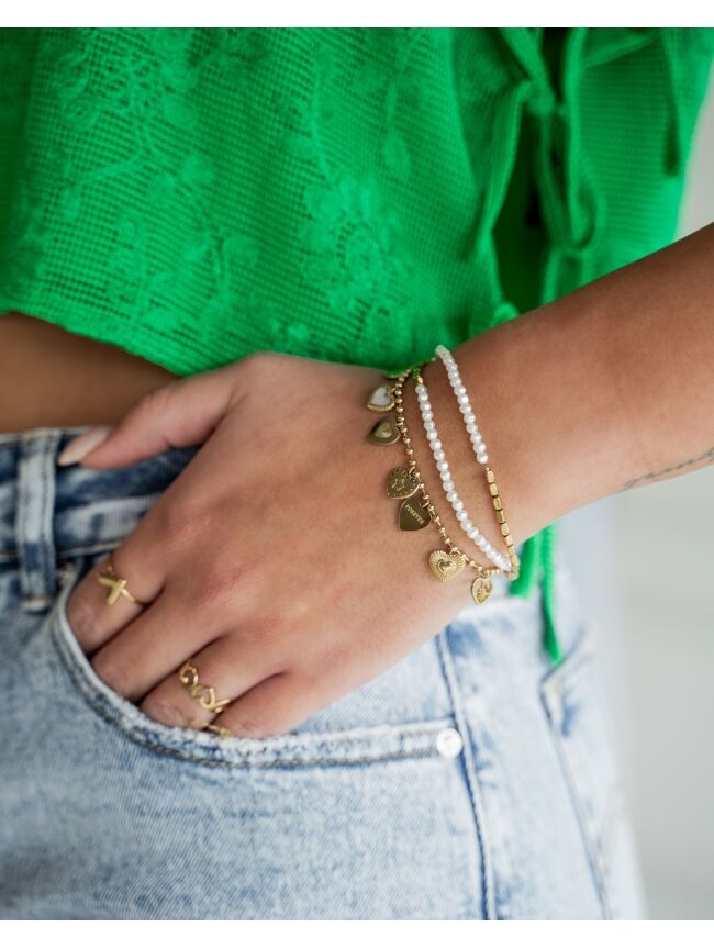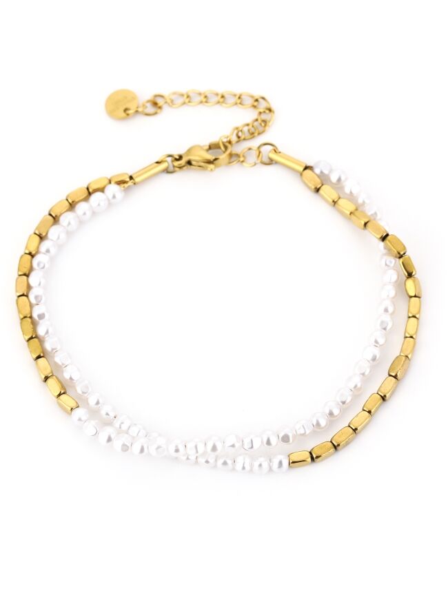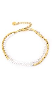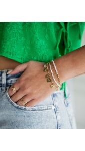 Deze dubbele armband met parels is de perfecte balans tussen klassiek en cool. De gelaagde look geeft extra dimensie aan elke outfit. Van minimal chic tot maximal glamour. Draag je ‘m solo voor subtiele luxe of combineer je ‘m met andere bangles voor een gedurfde stack.