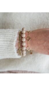 Deze elegante dubbele armband combineert glanzende beige kralen met een verfijnde goudkleurige snake chain. De neutrale beigetint zorgt voor een rustige, chique uitstraling en maakt de armband perfect te combineren met elke outfit. De snake chain voegt een moderne en luxe touch toe aan het geheel. Dankzij de verstelbare sluiting draagt de armband comfortabel en is hij eenvoudig aan te passen aan elke pols. Een tijdloos sieraad dat zowel solo als in combinatie met andere armbanden prachtig tot zijn recht komt.
