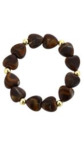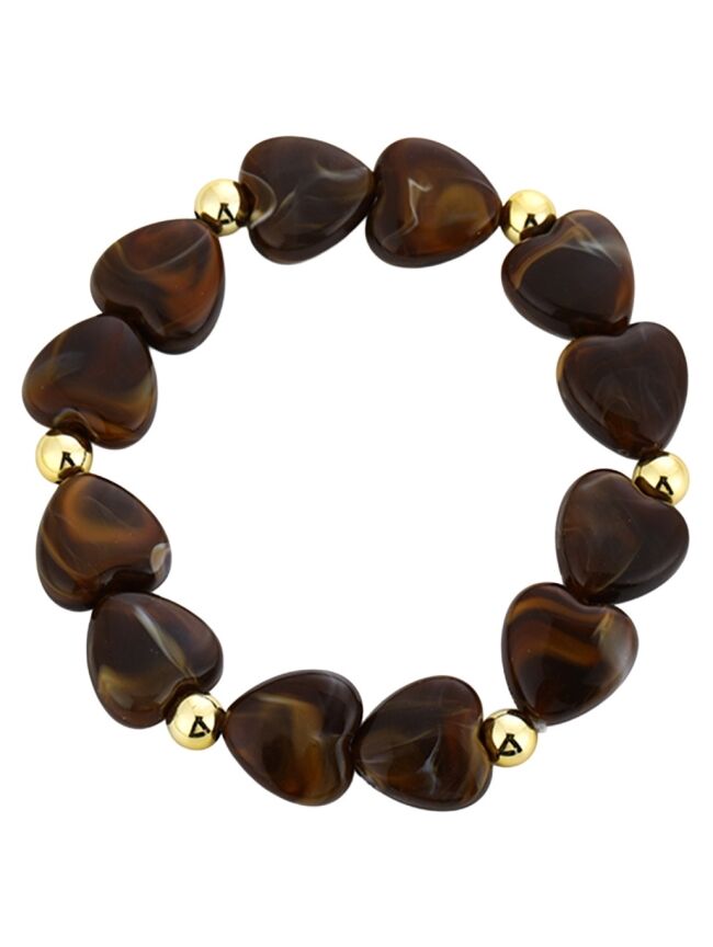 Deze stijlvolle armband met hartvormige kralen is een echte eyecatcher! De armband bestaat uit glanzende marmerlook hartjes in een warme donkerbruine tint, gecombineerd met subtiele goudkleurige details voor een chique finishing touch.