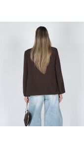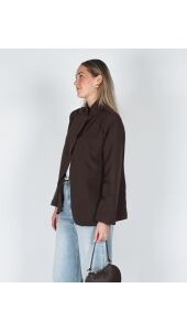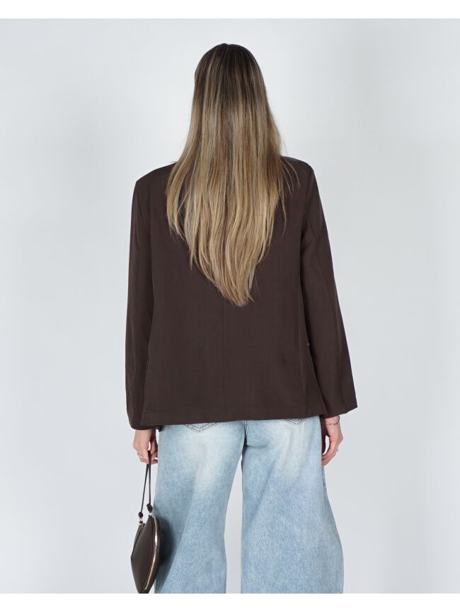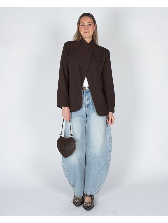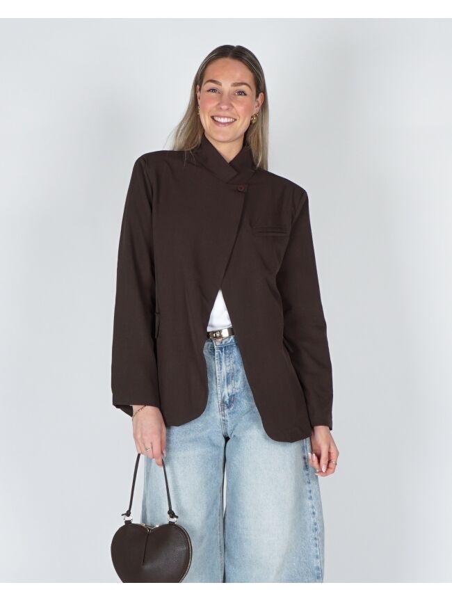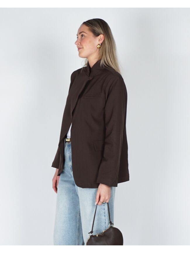 Minimalistisch, modern en moeiteloos chic. Deze blazer met hoge kraag is een verfijnde toevoeging aan je garderobe. Het silhouet en de asymmetrische sluiting geven het ontwerp een eigentijdse twist, terwijl de diepe donkerbruine kleur zorgt voor een warme, luxe uitstraling. We love it!