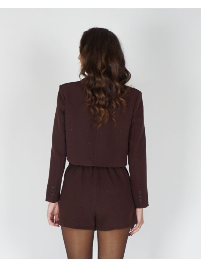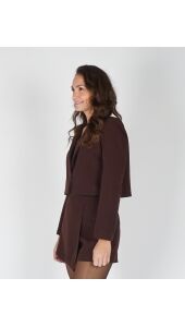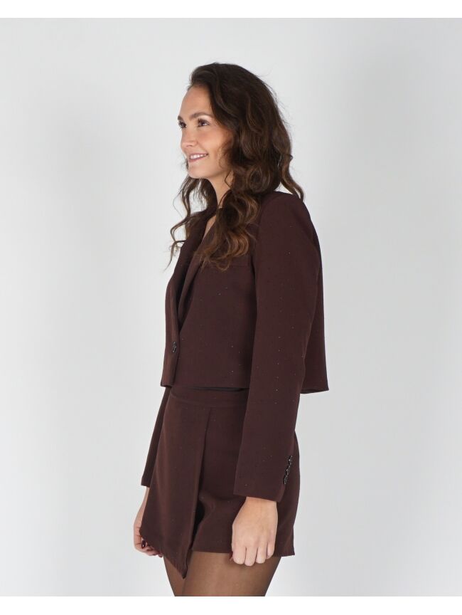 Maak elke look onvergetelijk met deze cropped blazer met strass steentjes in het bruin. De fonkelende details geven een chique vibe, perfect voor feestjes of een avond uit. Draag hem als set met de skort strass bruin voor een complete, stijlvolle look die straalt van elegantie.