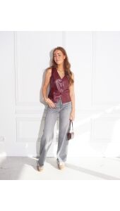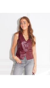 Nieuwe herfst must-have! Dit leren bordeaux gilet heeft een v-hals en knopen aan de voorkant en heeft twee paspel zakken voorop. Style met de een grijze jeans voor een perfecte going out look.