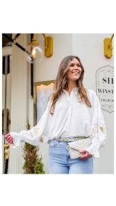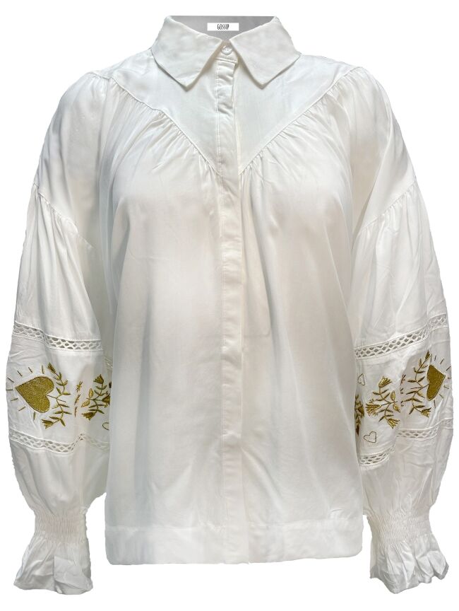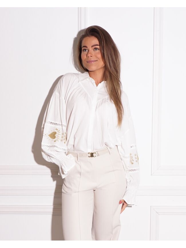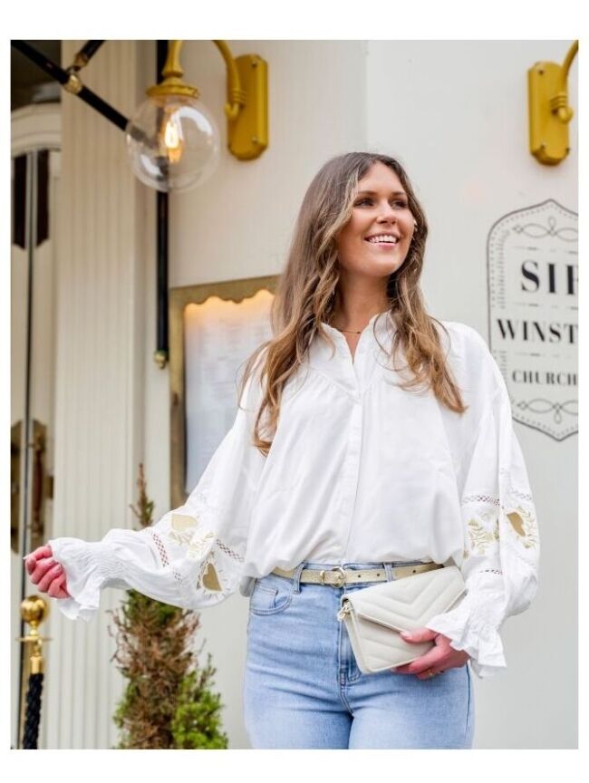 Deze mooie blouse heeft een chique uitstraling door de geborduurde details op de mouw. Je kunt de blouse op eindeloos combineren, bijvoorbeeld met een gilet erover of juist op een mooie pantalon. Creëer de look die bij jou past! Shop snel dit kleding item en vergeet je favoriete sieraden niet!