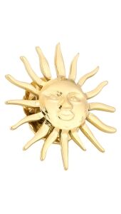 Deze prachtige golden sun broche brengt een vleugje zonneschijn naar je look. Het gedetailleerde ontwerp van de zon straalt warmte en energie uit, terwijl het gouden materiaal een elegante uitstraling geeft. Perfect om je outfit een speelse en stijlvolle touch te geven.