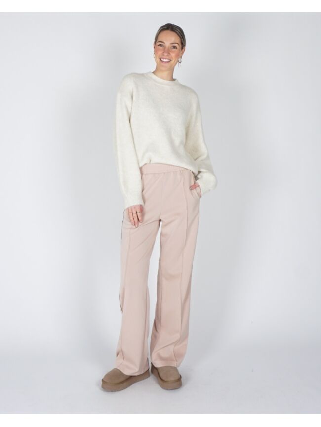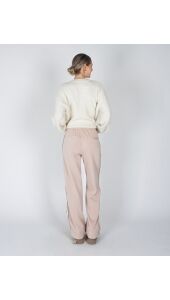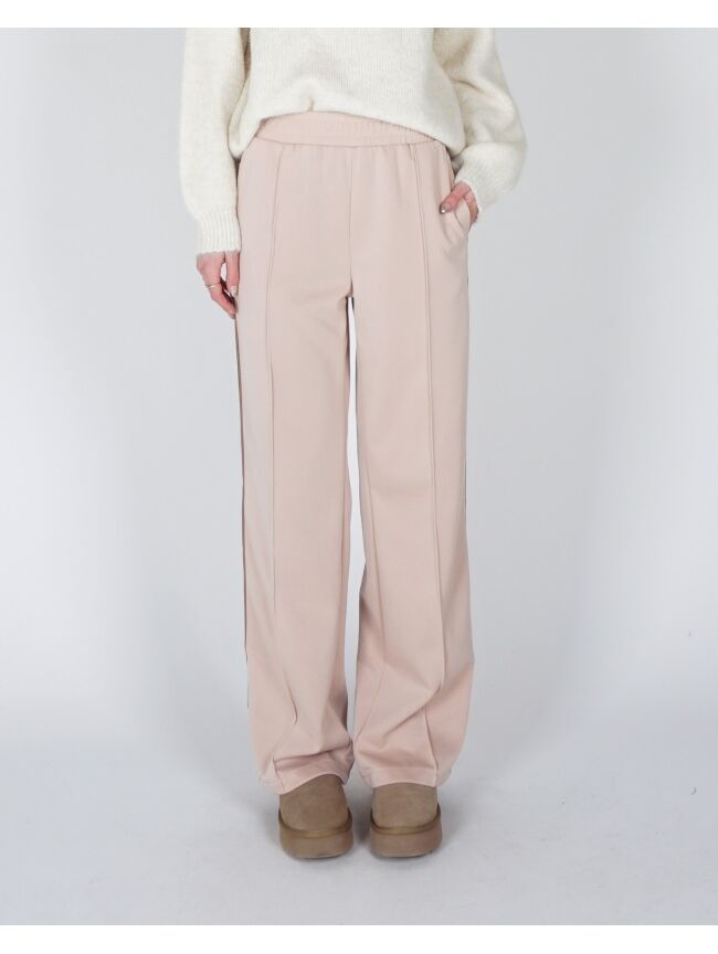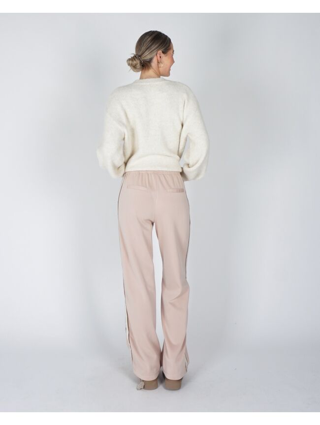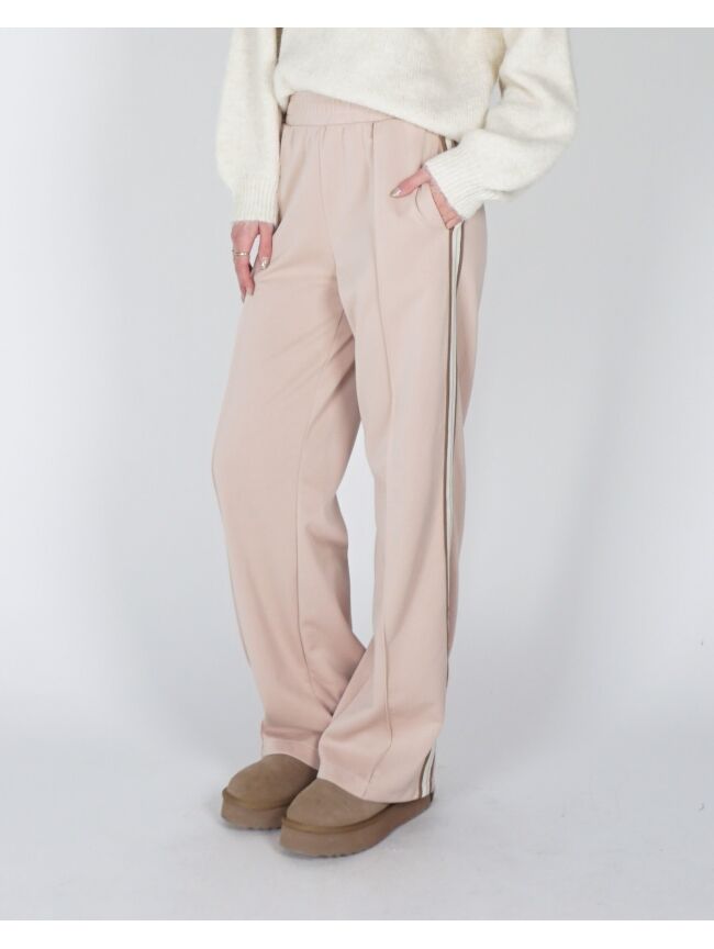 Deze beige pantalon met bies is strak, stijlvol en helemaal on-trend. De contrasterende bies geeft de broek een sporty-chic vibe. Perfect om eindeloos te combineren, van casual tot classy. Heeft een fijne elastieken band voor een stretchy fit.