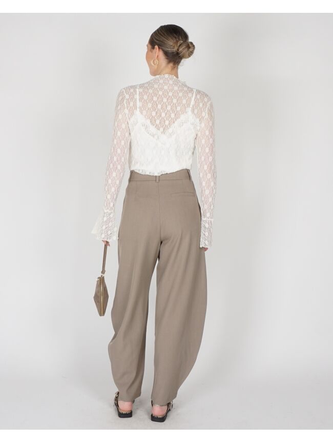 Deze taupe kleurige pantalon met balloon fit heeft een moderne en stijlvolle uitstraling. De wijder vallende pijpen zorgen voor een comfortabele pasvorm en een trendy silhouet. Perfect te combineren met een blouse, top of blazer voor een elegante look.