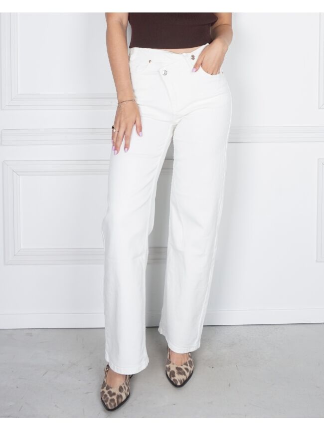 Deze wide leg jeans heeft een witte wassing en high-waisted fit. De straight fit en schuine knoop detail geven een coole twist aan dit tijdloze design. De katoenen kwaliteit zorgt voor een perfecte pasvorm.