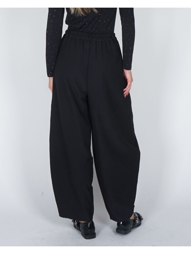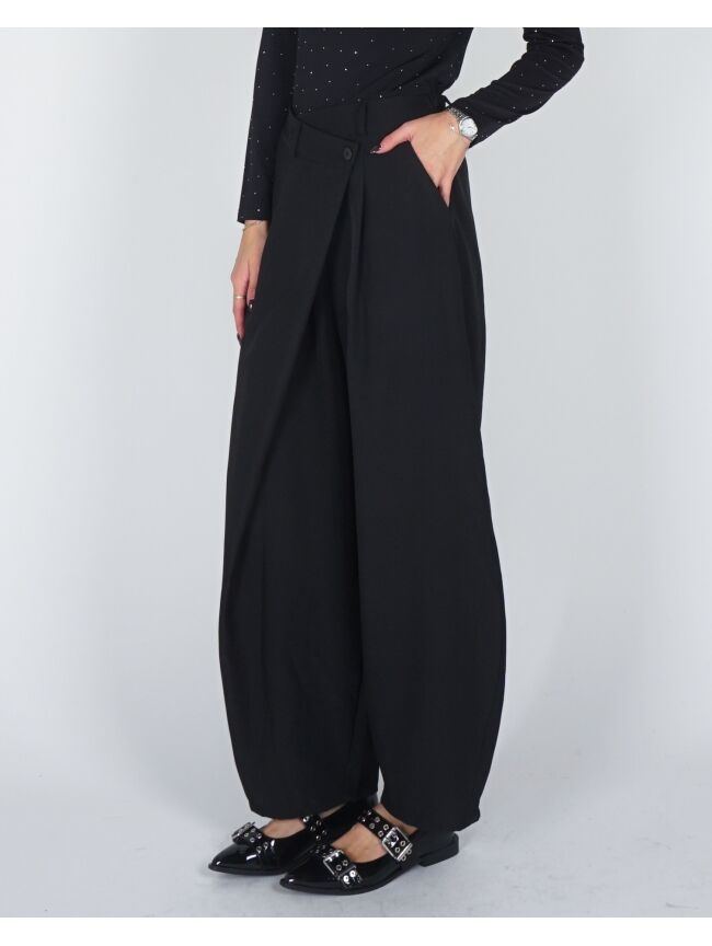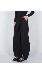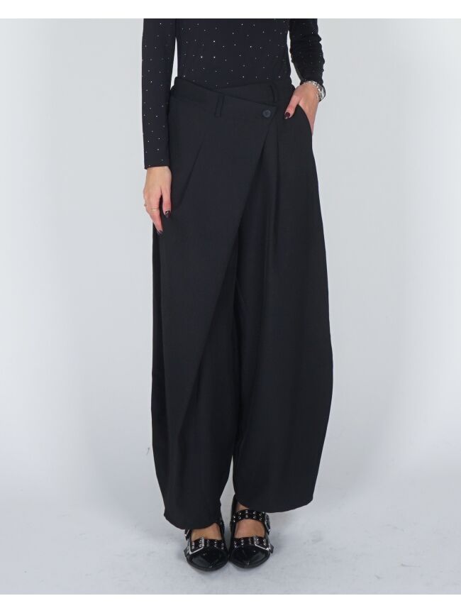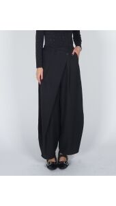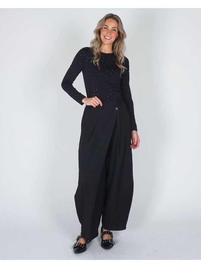 De coolste trend van het najaar! De overslag pantalon. Deze broek heeft een schuine knoop, zakken en een stretchy tailleband. De pantalon heeft een balloon model wat betekent dat de broek wijder is tot aan de knieën en dan tapser toeloopt aan de onderkant. Style met een gelijk kleurende top en je it-girl look is af.