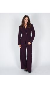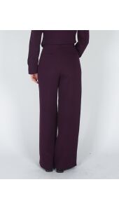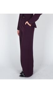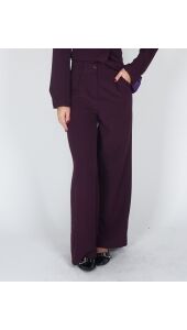 Deze pantalon in de kleur Plum heeft een hoge taille en elegante, wijde pijpen. De broek sluit met een knoop en rits en valt soepel om het lichaam. Perfect voor op kantoor of een etentje. Combineer met de bijpassende fitted blazer voor een complete, stijlvolle look.