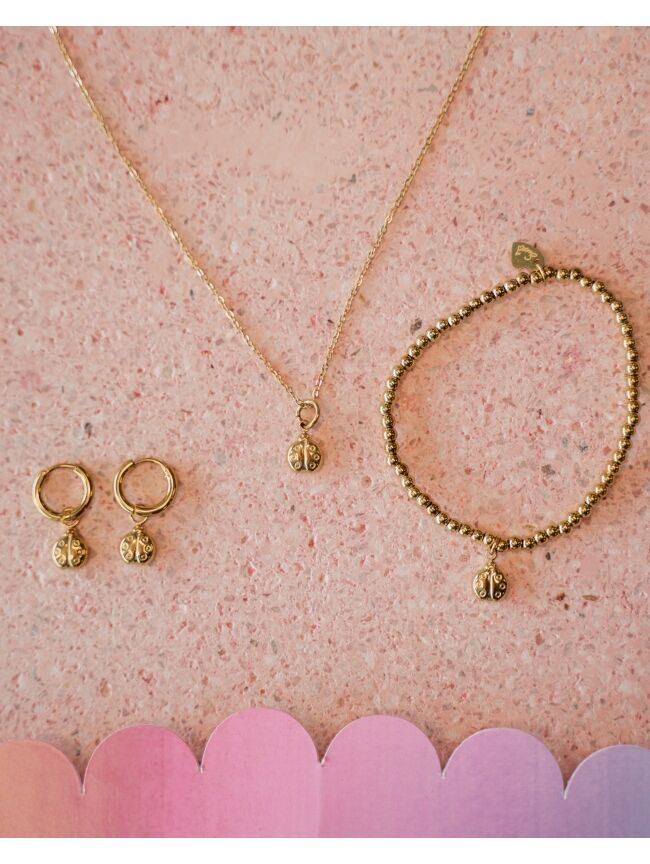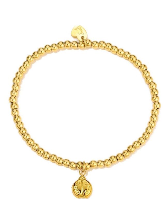 Een klein sieraad met grote charme! Deze goudkleurige armband van 15 cm heeft een vrolijk lieveheersbeestje als bedel en is gemaakt met elastiek, dus makkelijk om en af te doen.