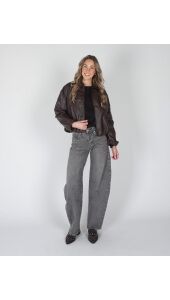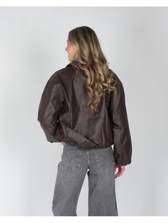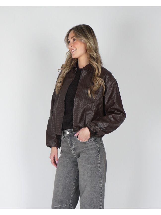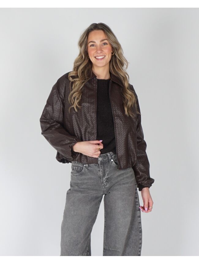 Deze leatherlook bomber met visgraatstructuur is dé perfecte mix van stoer en stylish. De luxe textuur en oversized fit maken ’m ideaal voor elke outfit, van casual tot chic. Style af met een gave barrel jeans, top of trui en je favoriete Gossip tas en je look is compleet. Verkrijgbaar in bordeaux en bruin.