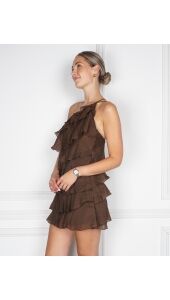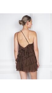 Get that classy look! Wauw, wij zijn verliefd op deze prachtige bruine jurk! De jurk heeft een bruine kleur en heeft een prachtige satijnen look die zorgt voor een stijlvolle look en is daardoor perfect voor ieder evenement. De achterkant van de jurk is ook echt prachtig! Draag de korte jurk naar een bruiloft of als je op een zomerse avond lekker gaat uit eten. Maak de look compleet met mooie statement sieraden, we love it!