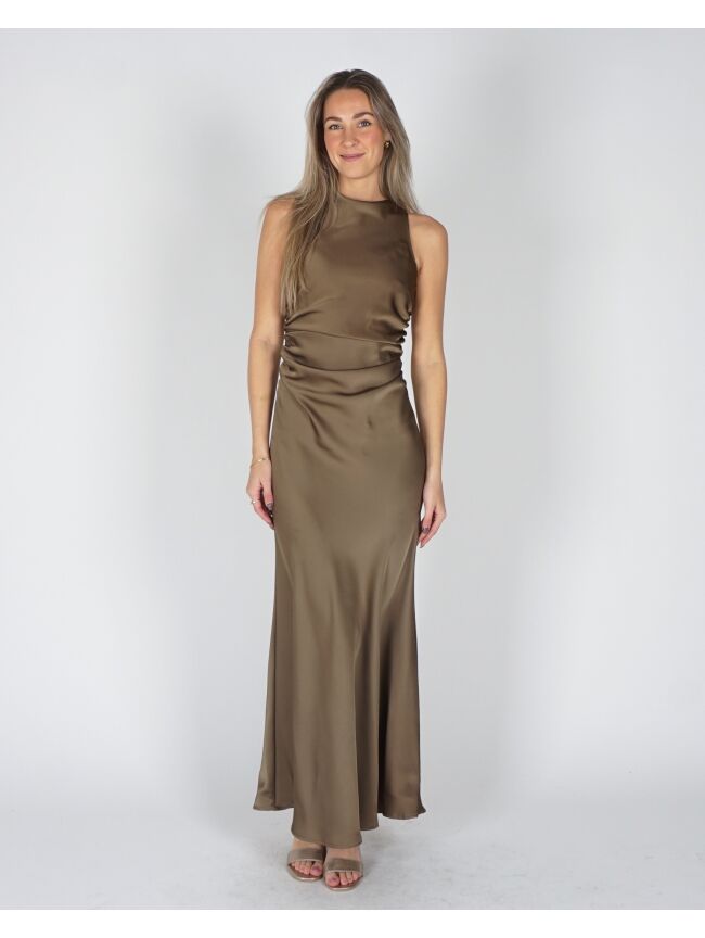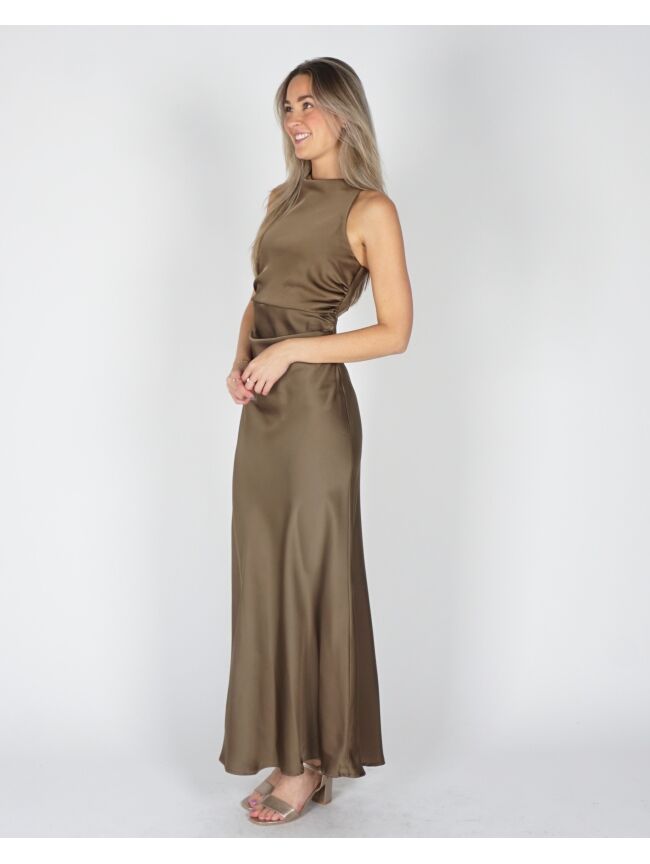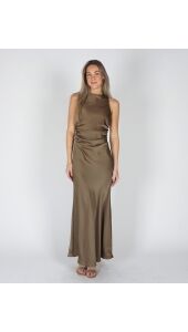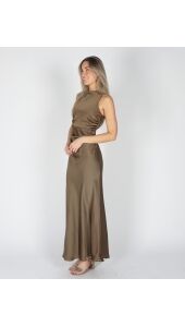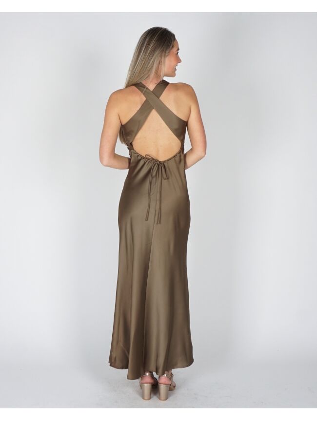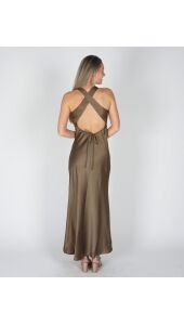 Deze lange satijnen jurk heeft een elegante halterneck en een prachtige open rug, waardoor hij meteen een echte showstopper is. De gladde, glanzende stof valt slank langs het lichaam en zorgt voor een luxe, vrouwelijke look, perfect voor bruiloften, gala’s en andere bijzondere gelegenheden.