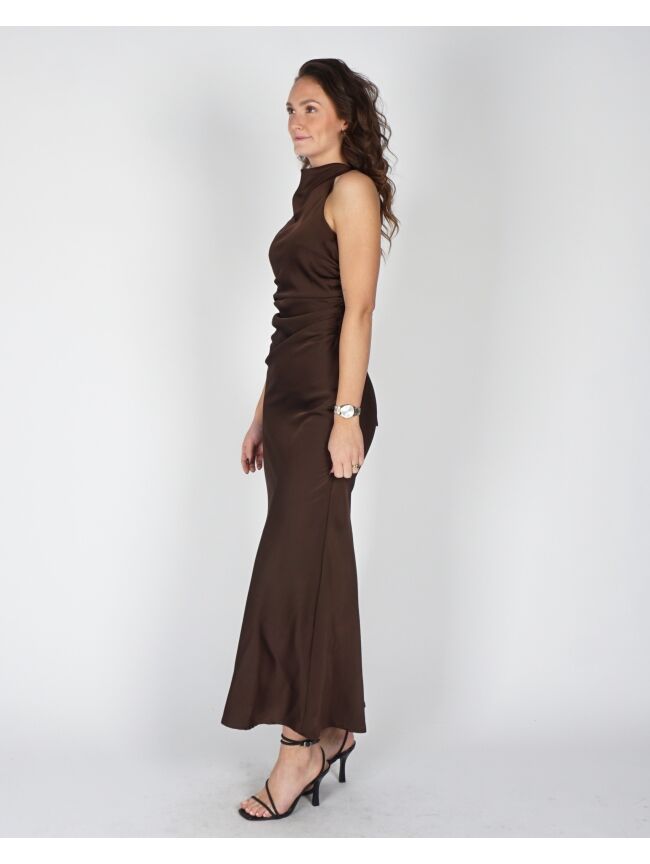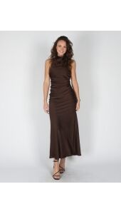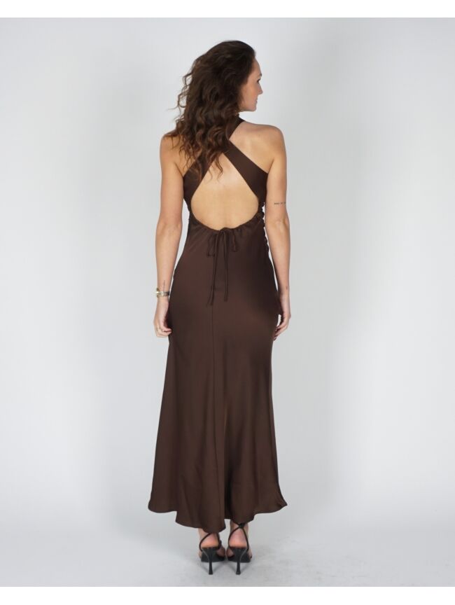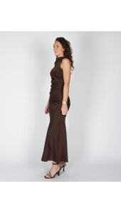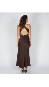 Deze lange satijnen jurk heeft een elegante halterneck en een prachtige open rug, waardoor hij meteen een echte showstopper is. De gladde, glanzende stof valt slank langs het lichaam en zorgt voor een luxe, vrouwelijke look, perfect voor bruiloften, gala’s en andere bijzondere gelegenheden.