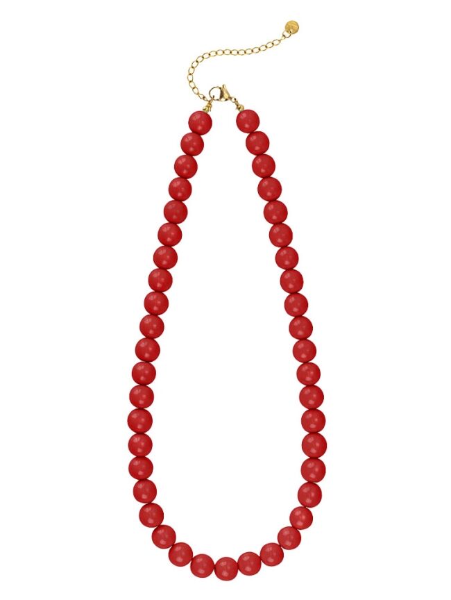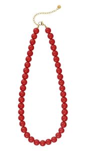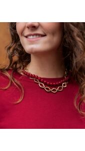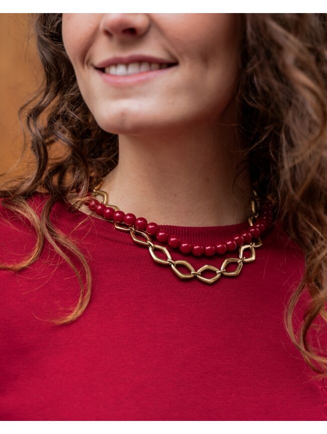 De ketting met rode kralen is een opvallende accessoire met dieprode kralen en verfijnde gouden accenten. De warme, krachtige kleur straalt passie en elegantie uit, en geeft elke outfit een stijlvolle boost. Perfect voor wie houdt van een gedurfde, chique look.