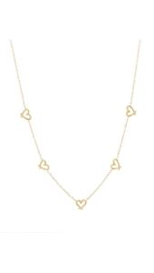 Deze elegante ketting is versierd met meerdere subtiele open hartjes die speels over de fijne goudkleurige schakelketting zijn verdeeld. Het minimalistische design geeft de ketting een romantische en vrouwelijke uitstraling, perfect voor elke dag én speciale momenten.