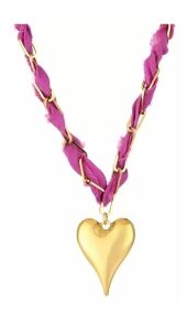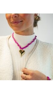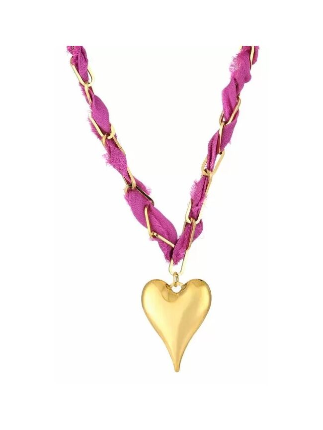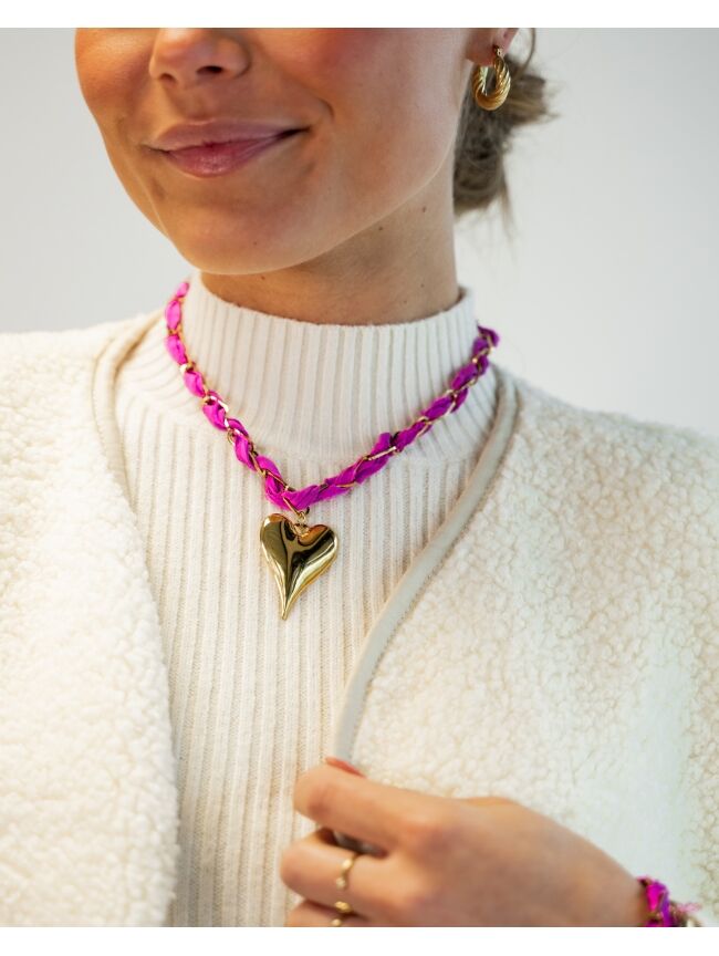 Make a statement met deze gevlochten ketting met fuchsia en groot hart bedel! Style op je favoriete knit of t-shirt en je look is helemaal compleet.