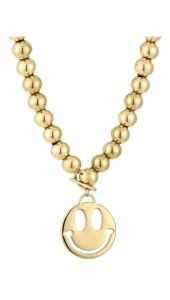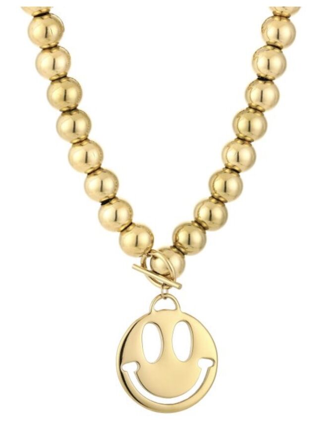 Deze opvallende ketting brengt instant good vibes dankzij de vrolijke smiley hanger. De goudkleurige kralenketting geeft het sieraad een trendy en luxe uitstraling, terwijl de smiley zorgt voor een speels en modern accent. De combinatie maakt deze ketting perfect om je outfit een fun touch te geven zonder in te leveren op stijl. Draag ‘m solo als statement piece of combineer met andere kettingen voor een edgy layered look.