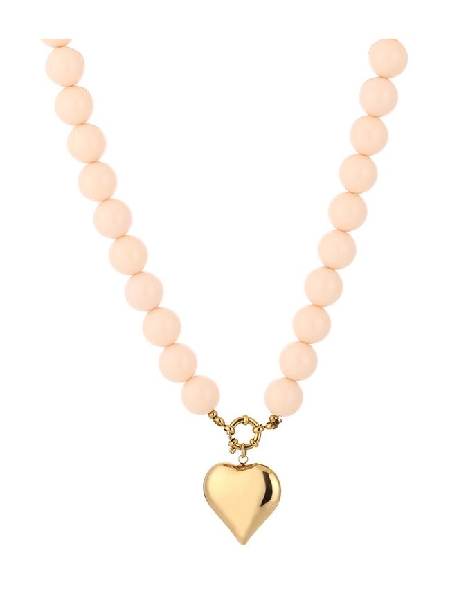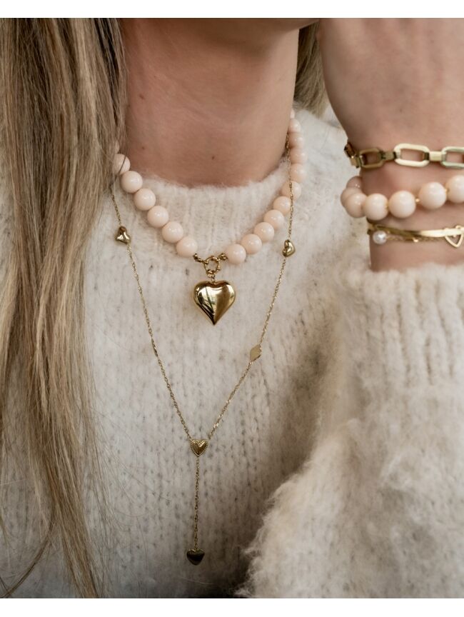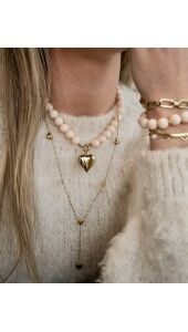 Deze kralenketting met hart is een echte eyecatcher met een romantische uitstraling. De zachte, lichtroze kralen geven de ketting een frisse en vrouwelijke look, terwijl het goudkleurige hart zorgt voor een elegante finishing touch. Perfect om je outfit net dat beetje extra te geven, zowel overdag als ’s avonds.