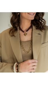 Deze kralenketting met hart is een echte eyecatcher met een romantische uitstraling. De donker bruine kralen geven de ketting een frisse en vrouwelijke look, terwijl het goudkleurige hart zorgt voor een elegante finishing touch. Perfect om je outfit net dat beetje extra te geven, zowel overdag als ’s avonds. Romantisch, trendy en helemaal on-trend.