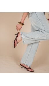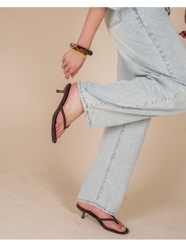 Deze bruine slipper met hak heeft een minimalistische en elegante uitstraling. De smalle bandjes en subtiele kitten heel geven de schoen een vrouwelijke touch. Perfect om te dragen onder een jeans, jurk of pantalon voor een stijlvolle look.