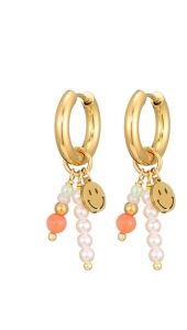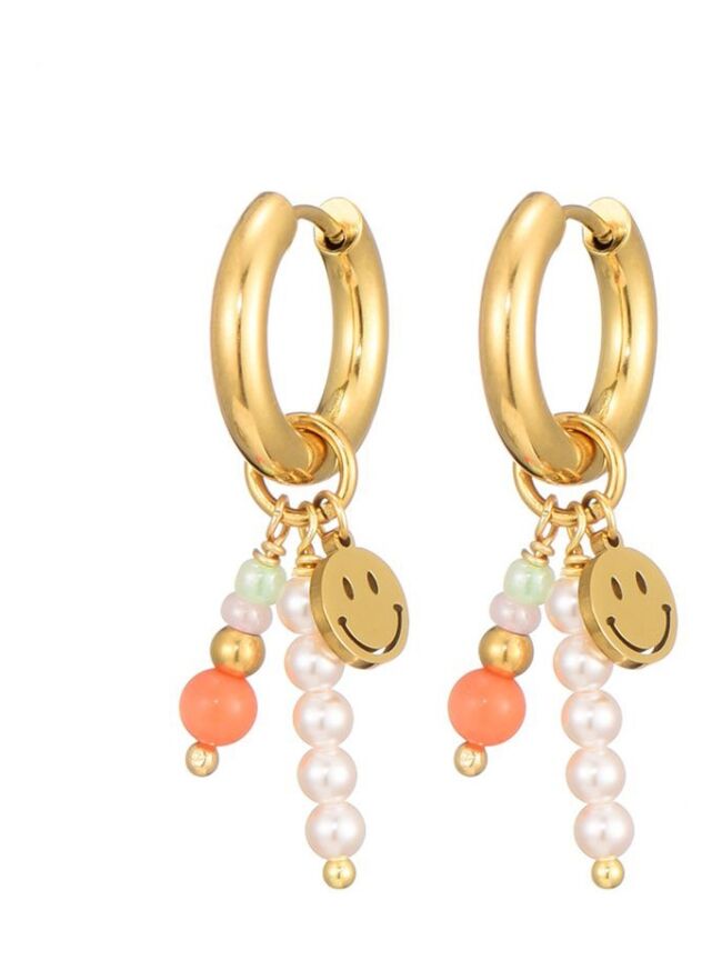Deze goudkleurige oorringen combineren vrolijke smileys met kleine pareltjes voor een speels effect. Een leuke mix die perfect past bij de frisse stijl van jonge meiden. Ze zitten licht en comfortabel, zodat ze de hele dag gedragen kunnen worden.