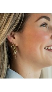 Deze statement oorbellen combineren meerdere speelse details in één stijlvol design. De gouden hoops zijn afgewerkt met een glanzend hartbedeltje, een subtiel kleur accent. De mix van elementen zorgt voor een trendy, maar toch tijdloze uitstraling.
